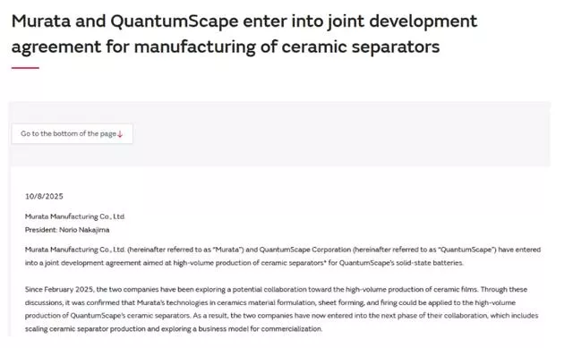 10月8日,QuantumScape与村田制作所(Murata)签订联合开发协议,大批量生产用于QuantumScape固态电池的陶瓷隔膜。