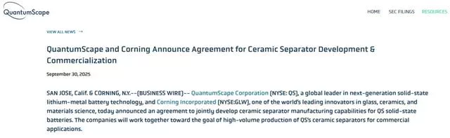 另一项合作发生在9月30日,QuantumScape和康宁公司(Corning)宣布签署联合开发协议,共同推进QS固态电池陶瓷隔膜的制造能力。